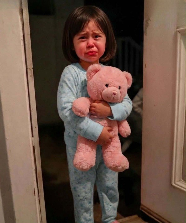 A small girl in pink pajamas stood there, clutching a worn teddy bear so tightly its ear bent under her grip.