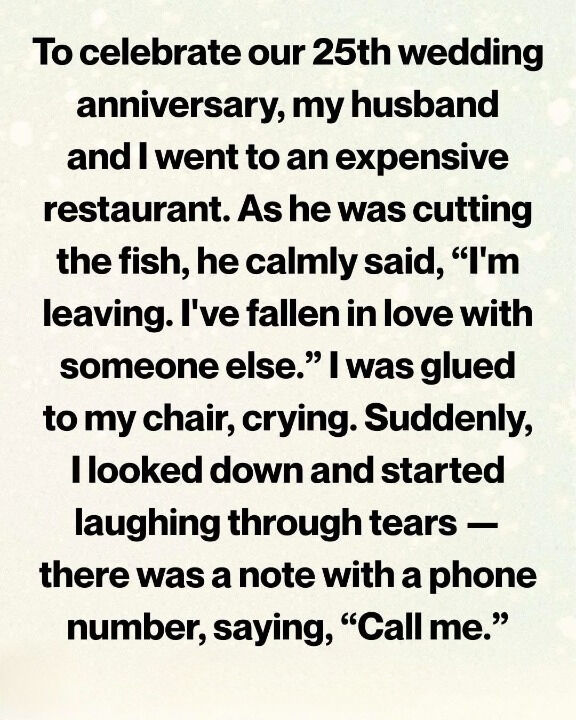 I sat there, unable to move, my anniversary ring suddenly heavy on my hand. Tears fell quietly onto the untouched plate in front of me while the world around me continued—glasses clinking, soft music playing, conversations flowing as if nothing had broken.