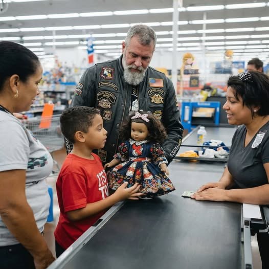 He told the cashier to ring up the doll and keep the remaining money for anything else the boy might need. When the child tried to protest, the biker crouched down until they were face to face.
