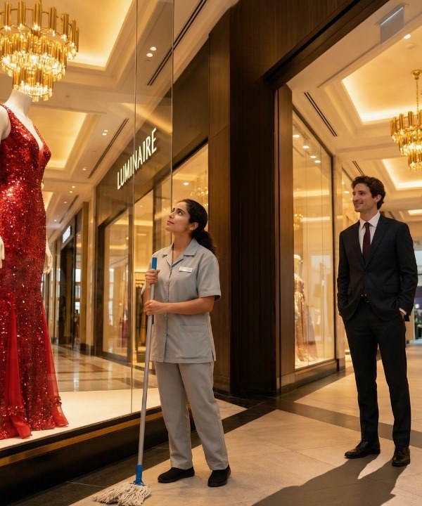 Near a boutique window stood a woman in a plain slate-gray uniform, methodically polishing the glass. The moment struck him like a sudden blow to the chest. Time had altered her features, and the uniform was modest, even unremarkable—but he recognized her instantly.