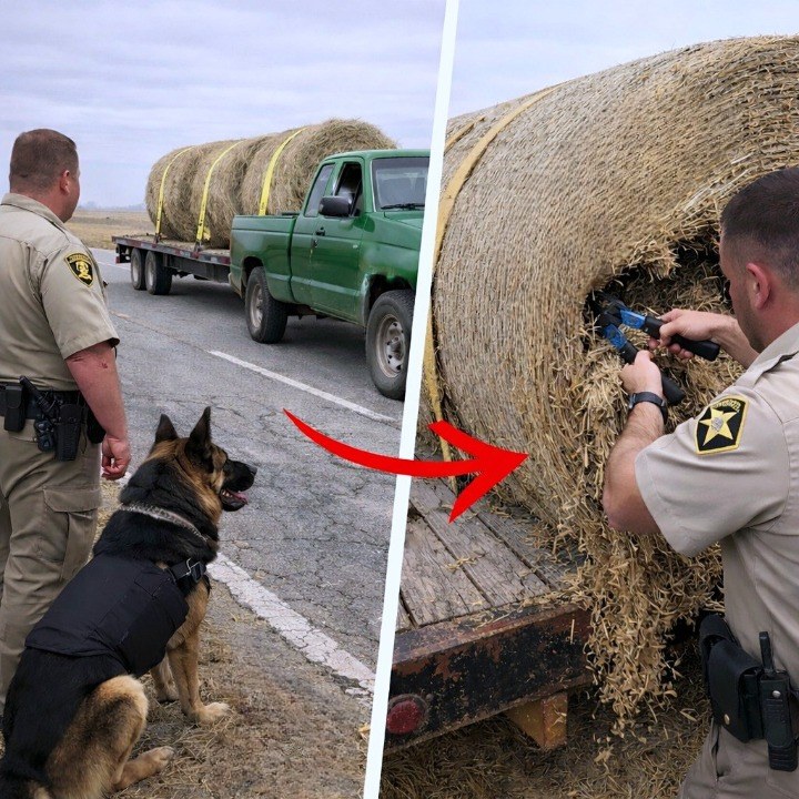 He retrieved Duke from the cruiser. The dog began his sweep, moving past the tires and wheel wells without interest. Then, abruptly, his behavior changed. Duke lunged toward the center hay bale, barking violently and scratching at the flatbed. This wasn’t a narcotics alert. It was frantic. Urgent.