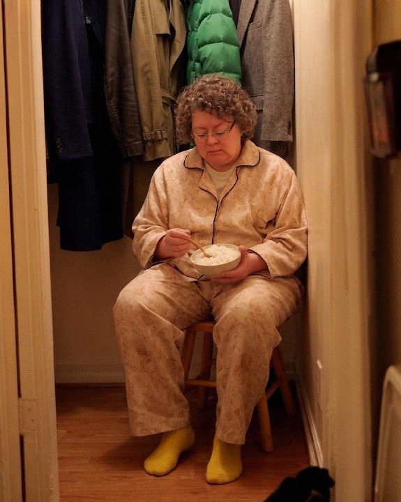 I took the bowl, my hands shaking, and went to sit on the small stool near the coats.